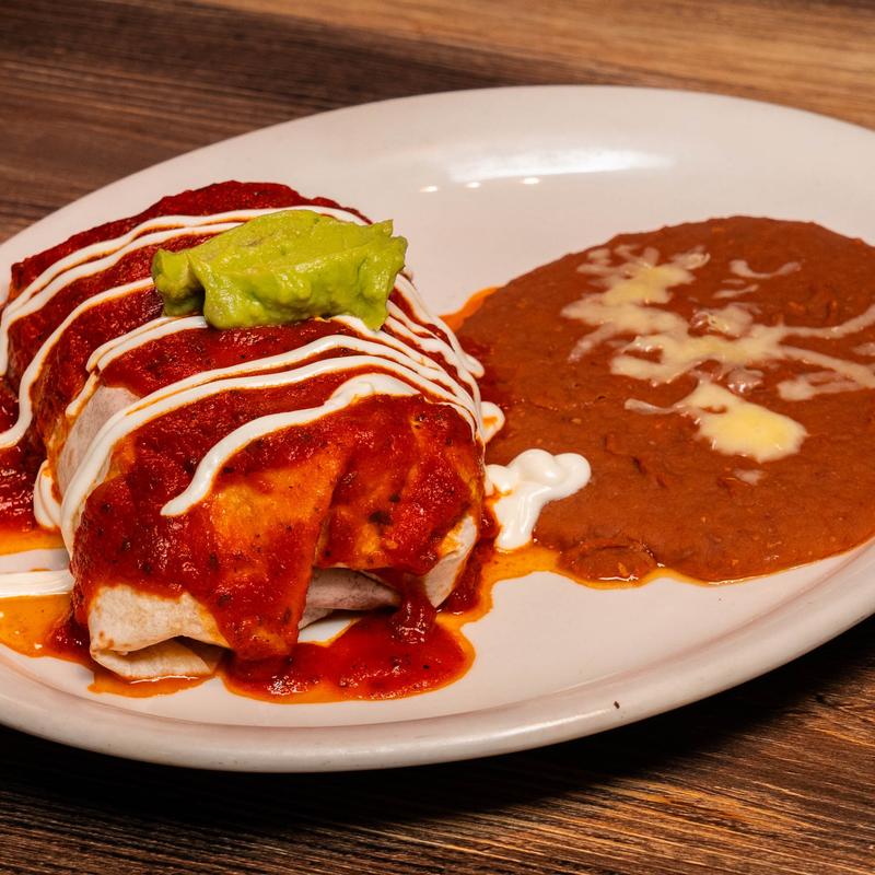 Grilled Steak or Chicken with onions, tomatoes, bell peppers and mushrooms filled with rice and shredded cheese in a large flour tortilla topped with salsa, guacamole, sour cream and beans on the side | Try with it Birria, Carnitas or Al Pastor +$3.00