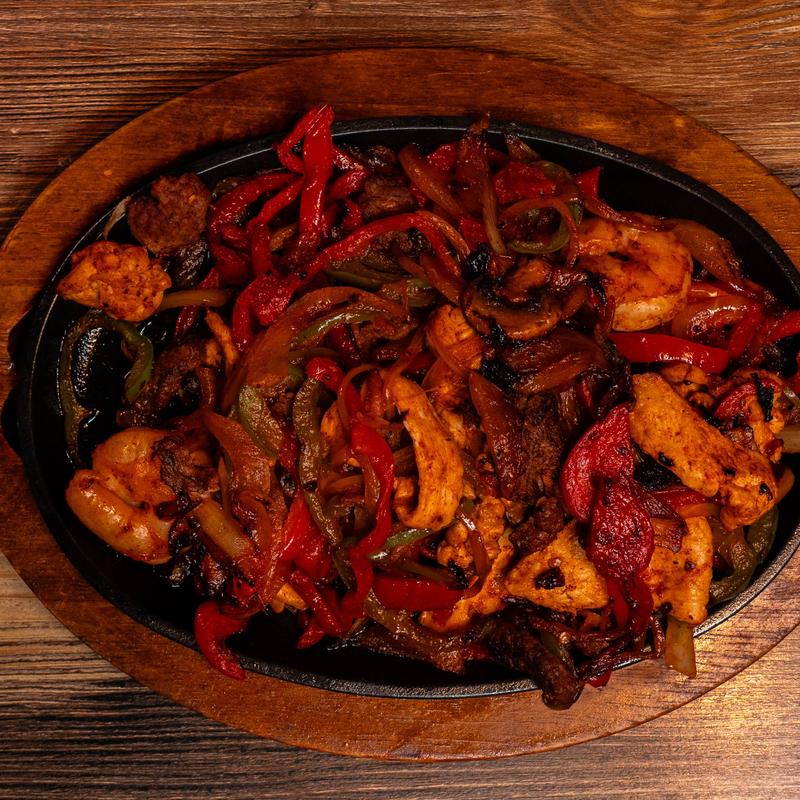 Chicken, steak and shrimp with bell peppers, onions, tomato and mushrooms topped with guacamole salad, sour cream and homemade queso dip