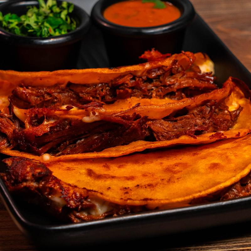 Three tacos with slow-cooked tender beef, melted cheese, onions and cilantro. Includes beef broth for dipping