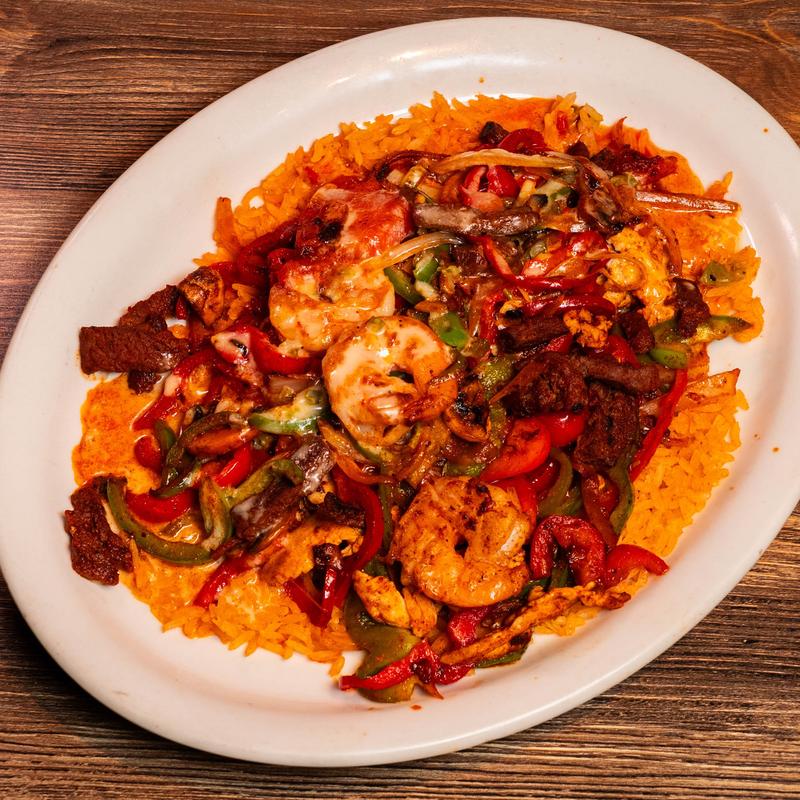 Chicken, steak and shrimp on a bed of Mexican rice with bell peppers, onions, tomatoes and mushrooms. Topped with homemade cheese sauce